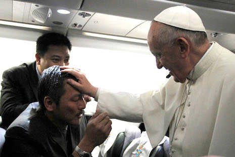 Pope Francis touches the head of a Filipino cameraman aboard the papal plane (Photo by Joe Torres)