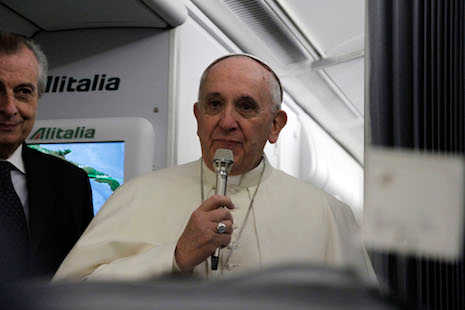 Pope Francis greets journalists on the papal plane to Sri Lanka (Photo by Joe Torres)